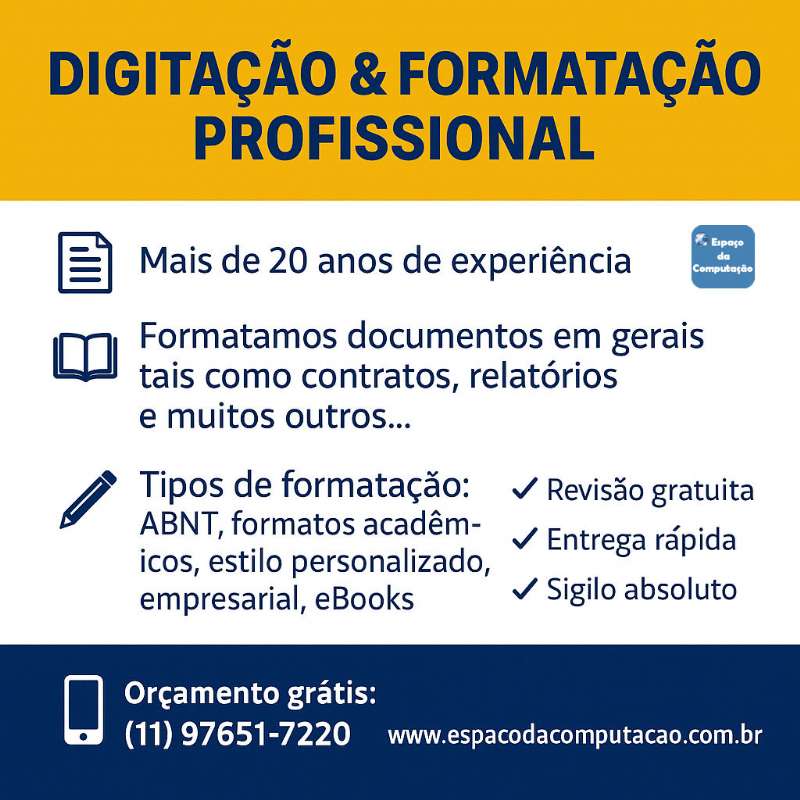 Digitação e Formatação de Documentos ou Trabalhos Com Qualidade e PrecisãoPreço (R$): A Combinar 64 Visitas |
